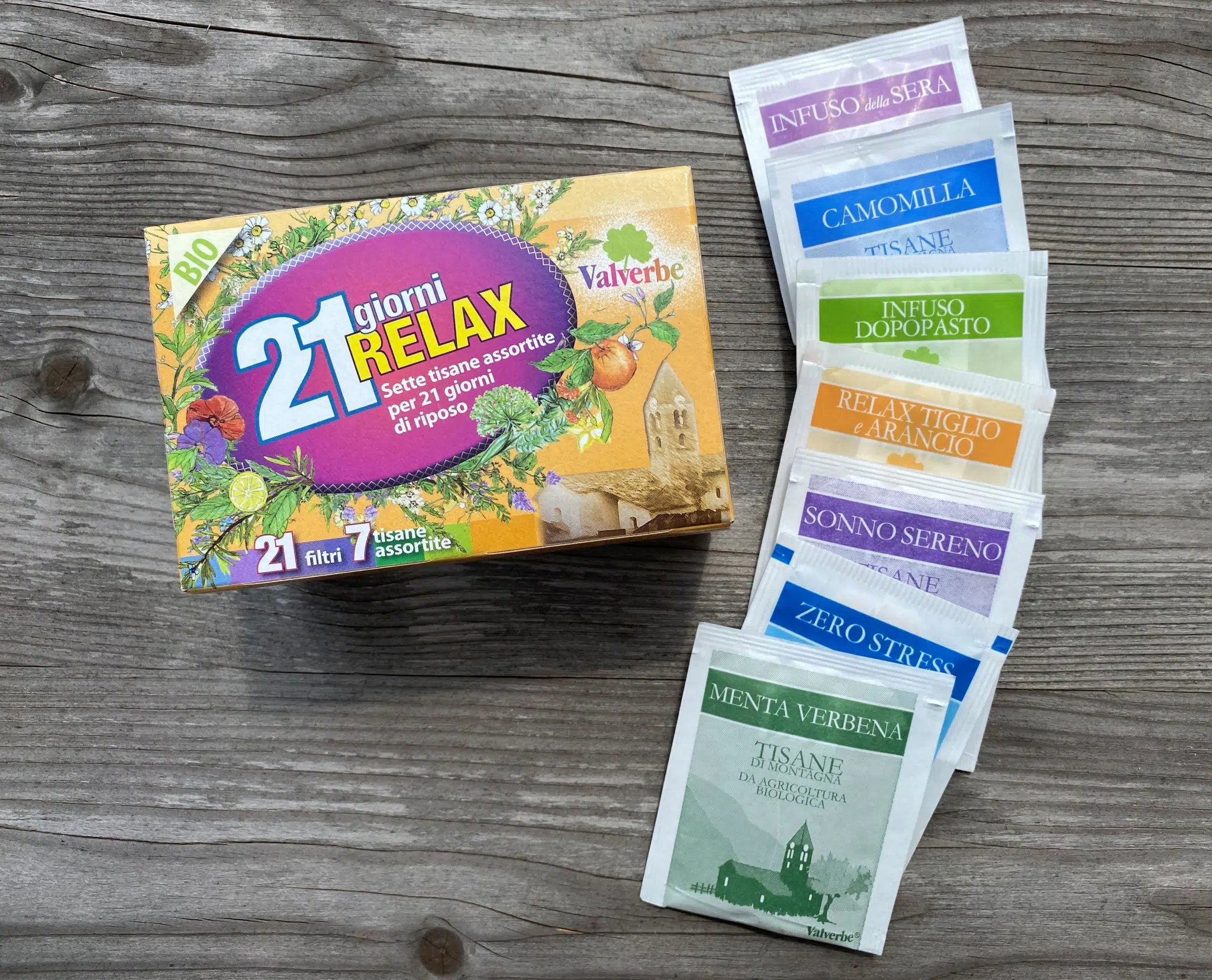 La Tisana 21 Giorni Relax è un programma guidato di 3 settimane composto da 7 tisane diverse (3 bustine ogni gusto – 1 ogni sera della settimana).