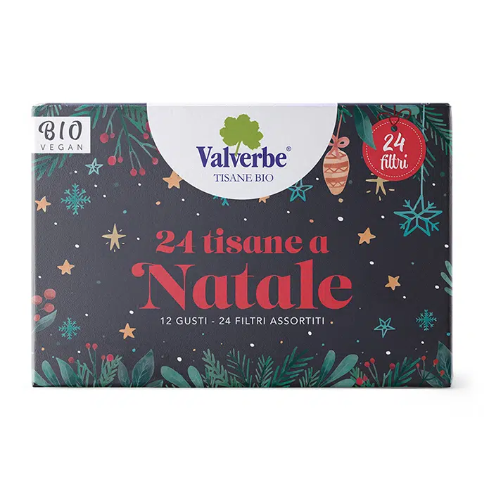 24 ASSORTED FILTER BAGS IN 12 DIFFERENT FLAVOURS in a mini advent calendar, a herbal tea a day until Christmas! In the package you will find the following flavours (2 sachets for each flavour) to taste day after day until you open the “Christmas herbal tea” sachet on December 24th. – Liquorice Infusion – ChocoOrange Herbal Tea – Relaxing Lime and Orange Herbal Tea – Lemon and Ginger Infusion – After-Meal Infusion – Draining Herbal Tea – Evening Infusion – Alpine Echinacea Herbal Tea – Blueberry and Raspberry Infusion – Wild Strawberry and Currant Herbal Tea – Citrus and Spice Rooibos – Valverbe Christmas Herbal Tea