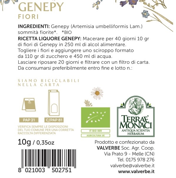 RECETTE LIQUEUR DE GÉNÉPI : Faites macérer 10 g de fleurs de génépi dans 250 ml d'alcool au bon goût pendant 40 jours. Retirez les fleurs et ajoutez un sirop composé de 110 g de sucre et 450 ml d'eau. Laisser reposer 20 jours et filtrer avec un filtre en papier.