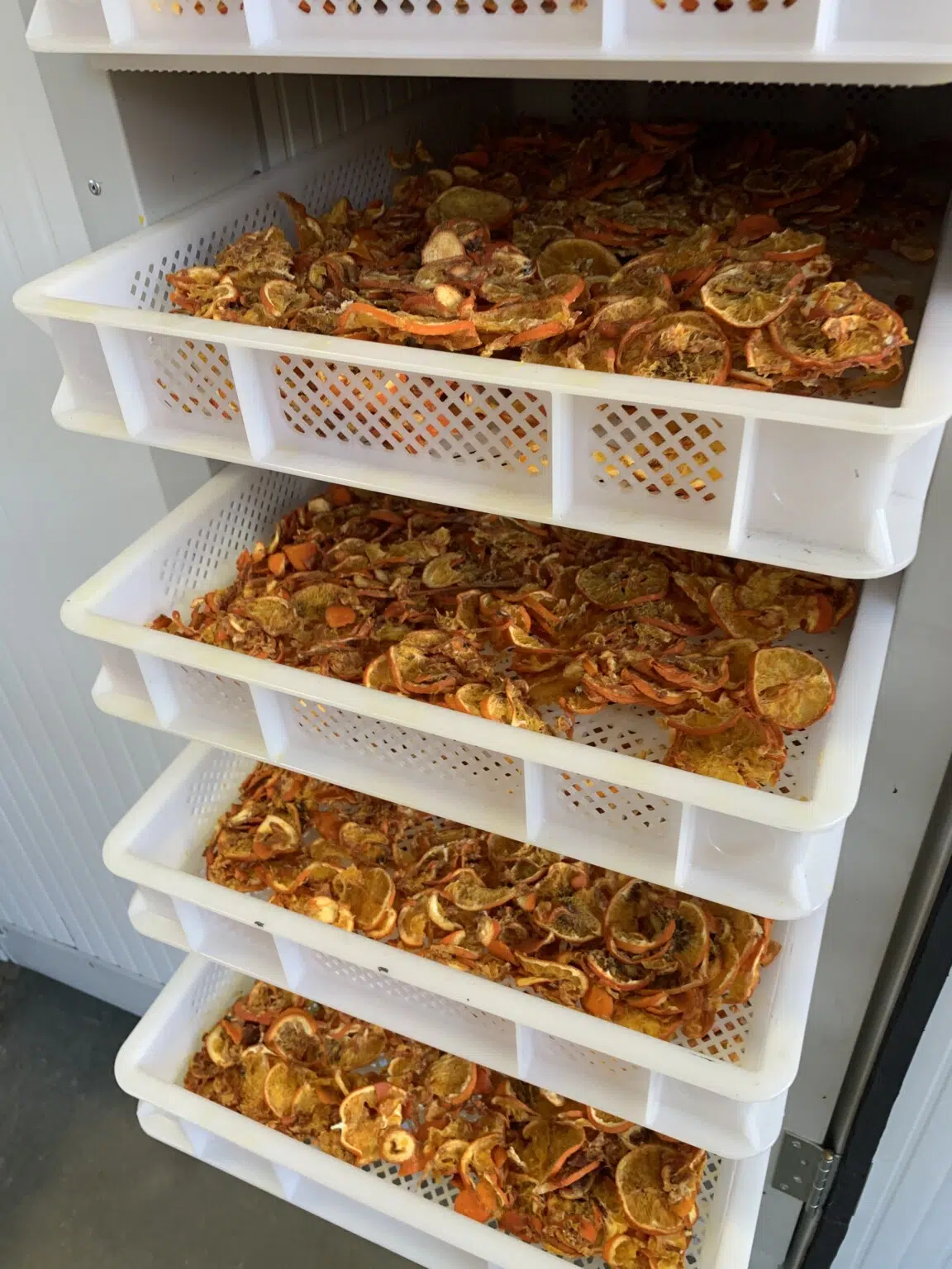 Le erbe vengono sottoposte allo stesso processo ma in impianti più grandi e senza cassette in quanto il volume di una pianta fresca rispetto a un frutto tagliato è diverso.