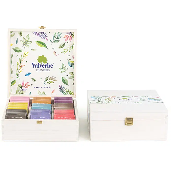 Il cofanetto in legno naturale Valverbe è costruito a mano. Artigiani di un tempo lavorano ogni dettaglio creando un prodotto solido, ma al contempo raffinato, ideale per un regalo o per creare un esclusivo angolo tisaneria all’interno di un locale (bar, hotel, ristorante, SPA etc…) o addirittura direttamente a casa.
