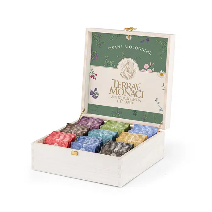 Cofanetto tisane PIENO in pregiato legno bianco TerraeMonaci con 90 filtri – 130 g90 filtri-130 g.