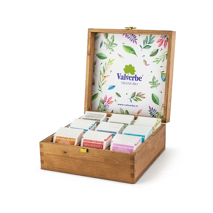 Il cofanetto in legno naturale Valverbe è costruito a mano. Artigiani di un tempo lavorano ogni dettaglio creando un prodotto solido, ma al contempo raffinato, ideale per un regalo o per creare un esclusivo angolo tisaneria all’interno di un locale (bar, hotel, ristorante, SPA etc…) o addirittura direttamente a casa.