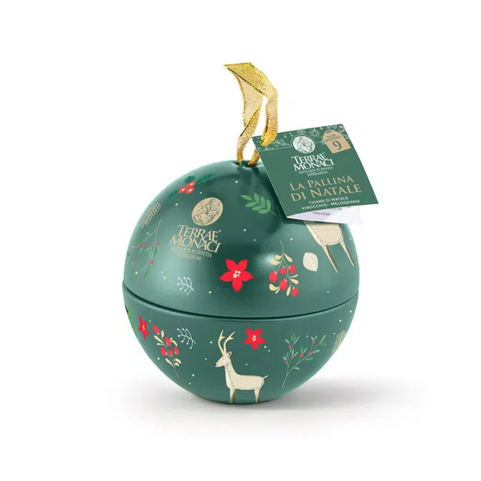 Rendi le feste ancora più speciali con questa deliziosa pallina natalizia in latta, firmata Terrae Monaci, decorata con motivi festivi e piena di Tisane Bio. Un’idea regalo originale e rilassante, perfetta per chi ama coccolarsi con una bevanda calda durante l’inverno.